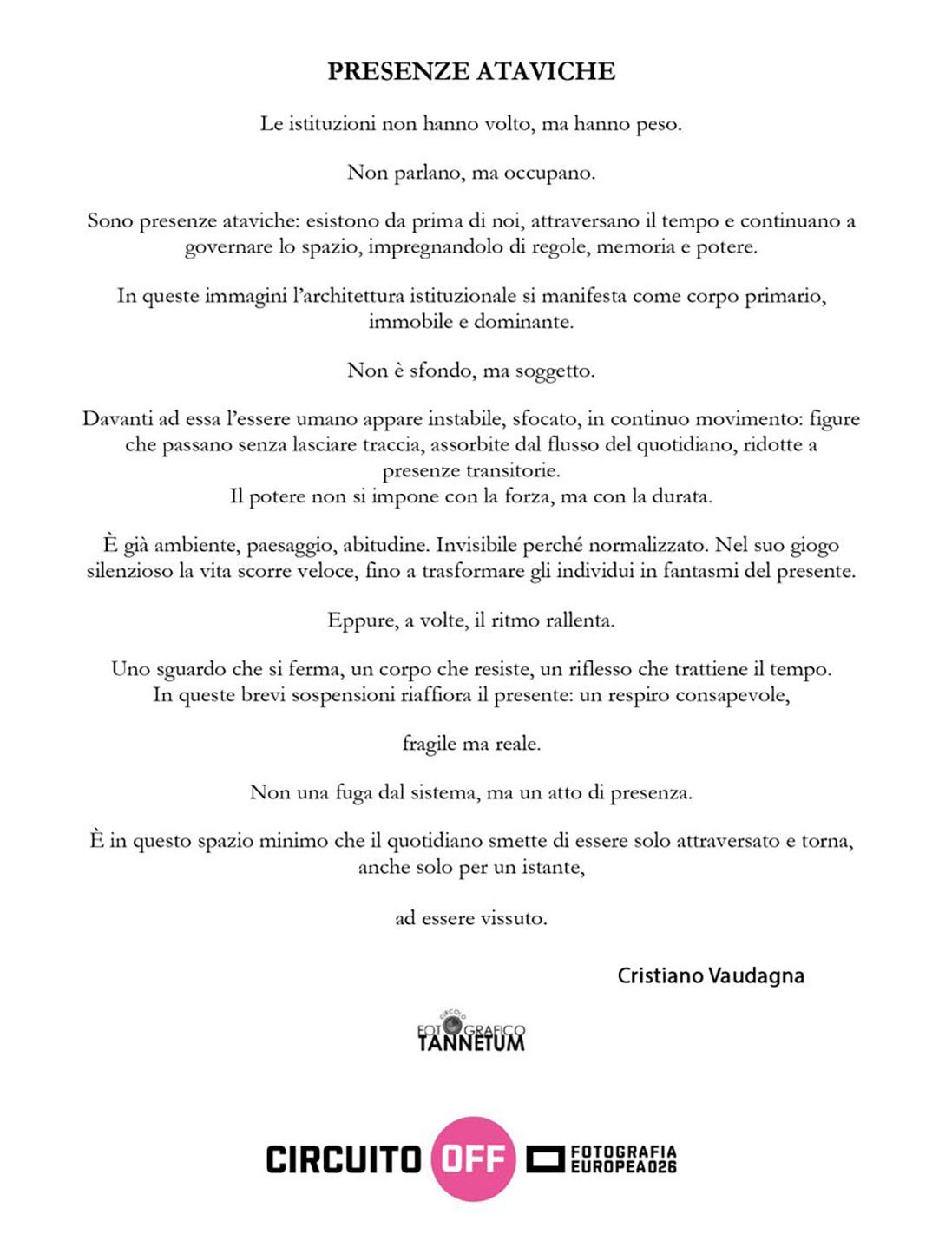 Le istituzioni non hanno volto, ma hanno peso. Non parlano, ma occupano. Sono presenze ataviche: esistono da prima di noi, attraversano il tempo e continuano a governare lo spazio, impregnandolo di regole, memoria e potere. In queste immagini l’architettura stituzionale si manifesta come corpo primario, immobile e dominante. Non è sfondo, ma soggetto. Davanti a essa l’essere umano appare instabile, sfocato, in continuo movimento. Figure che passano senza lasciare traccia, assorbite dal flusso del quotidiano, ridotte a presenze transitorie. Il potere non si impone con la forza, ma con la durata. È già ambiente, paesaggio, abitudine. Invisibile perché normalizzato. Nel suo giogo silenzioso la vita scorre veloce, fino a trasformare gli individui in fantasmi del presente. Eppure, a volte, il ritmo rallenta. Uno sguardo che si ferma, un corpo che resiste, un riflesso che trattiene il tempo. In queste brevi sospensioni riaffiora il presente: un respiro consapevole, fragile ma reale. Non una fuga dal sistema, ma un atto di presenza. È in questo spazio minimo che il quotidiano smette di essere solo attraversato e torna, anche solo per un istante, ad essere vissuto.